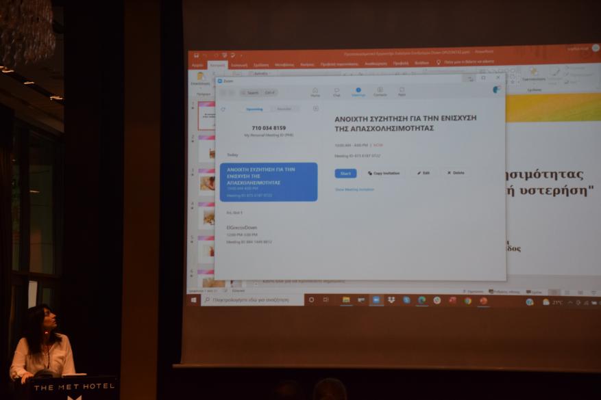 Ανοιχτή συζήτηση του προεπαγγελματικού εργαστηρίου "ΟΡΙΖΟΝΤΑΣ" του Συλλόγου συνδρόμου Down Ελλάδος με θέμα την απασχολησιμότητα ατόμων με νοητική αναπηρία πραγματοποιήθηκε στο ξενοδοχείο ΜΕΤ την Τετάρτη 29/9/2021.
