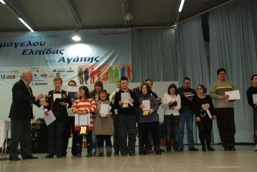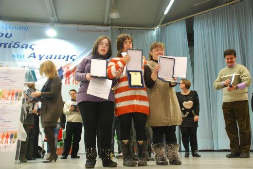 Εκδήλωση της Νομαρχίας στην οποία βραβεύτηκαν εξυπηρετούμενοι της δομής μας (16/1/2012) Στην Εκδήλωση Αγάπης, Ελπίδας και Χαμόγελου που διοργανώθηκε από τη Νομαρχία Θεσσαλονίκης βραβεύτηκαν οι Θεοδώρα Λέρα, Νατάσα Θεοδωρίδου, Παρασκευόπουλος Χρήστος και Βαρουσιάδου Φλώρα