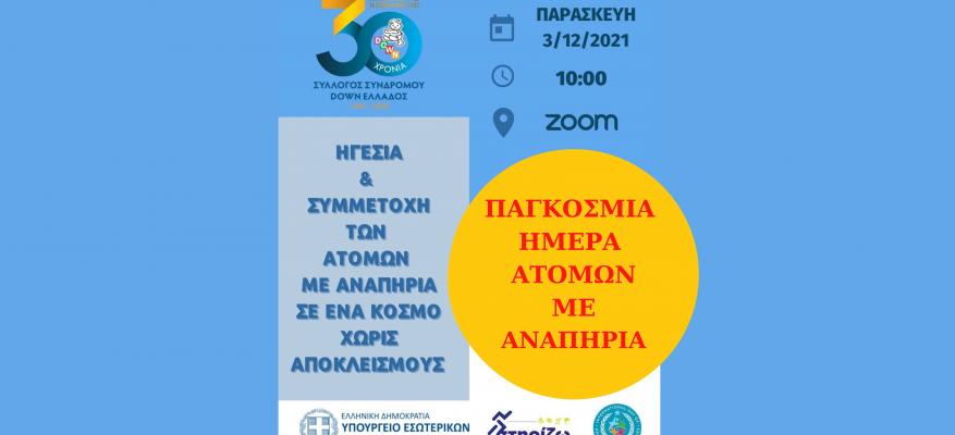 Την Παρασκευή 3 Δεκεμβρίου, Παγκόσμια Ημέρα ΑΜΕΑ, ο Σύλλογός μας με την υποστήριξη του προγράμματος "στηρίζω" του Υπουργείου Μακεδονίας- Θράκης, διοργάνωσε διαδικτυακή ημερίδα με θέμα " ΗΓΕΣΙΑ ΚΑΙ ΣΥΜΜΕΤΟΧΗ ΤΩΝ ΑΤΟΜΩΝ ΜΕ ΑΝΑΠΗΡΙΑ ΣΕ ΕΝΑΝ ΚΟΣΜΟ ΧΩΡΙΣ ΑΠΟΚΛ